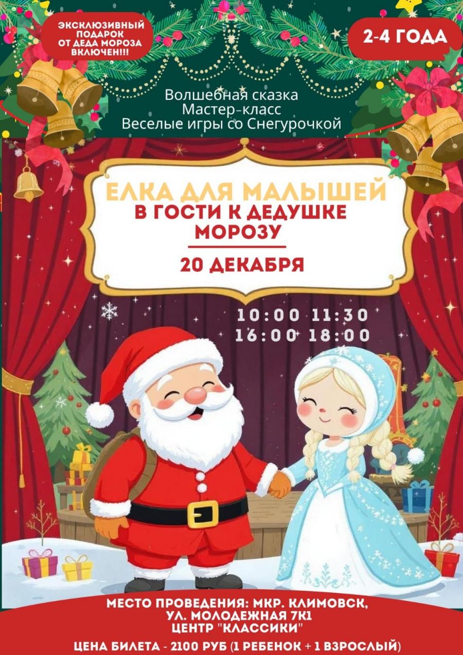 Камерное новогоднее представление для самых юных посетителей. Ребята отправятся в увлекательное путешествие в гости к Дедушке Морозу в компании сказочных зверушек.